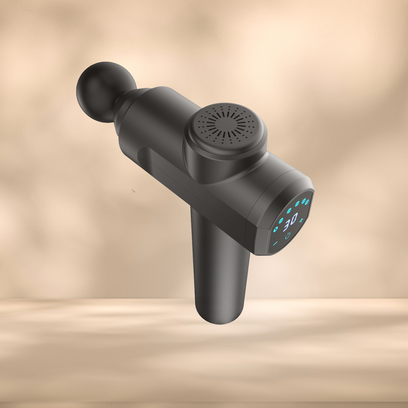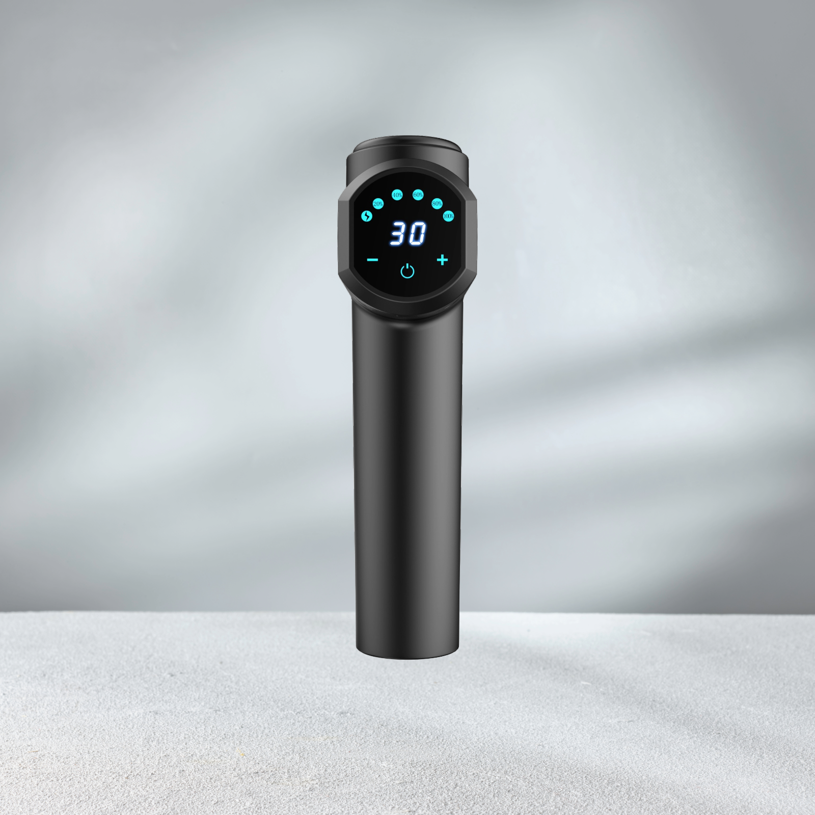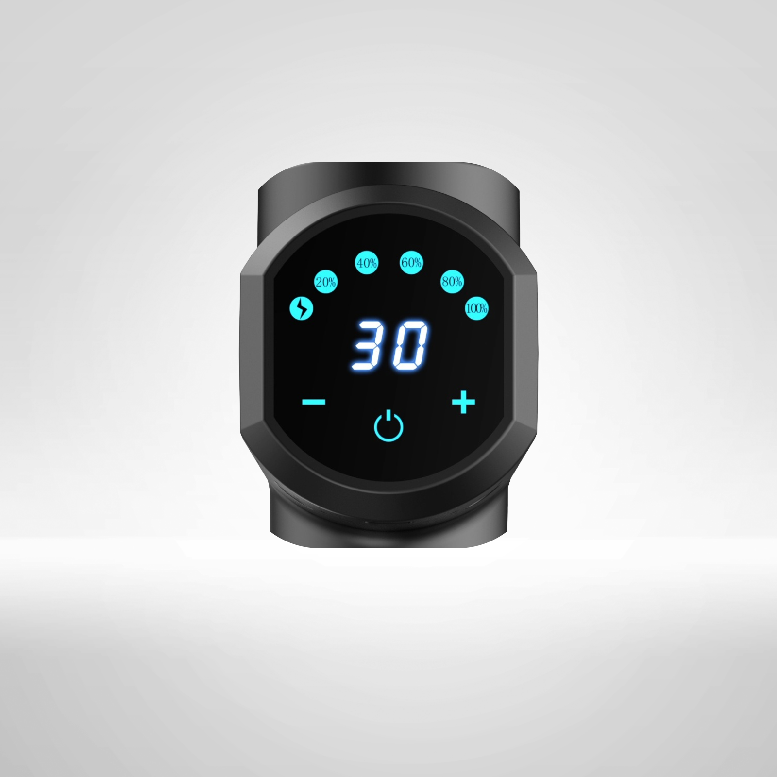 Press and hold the power button to turn on the massage gun. The LCD touchscreen will light up, showing you the current speed and settings. -